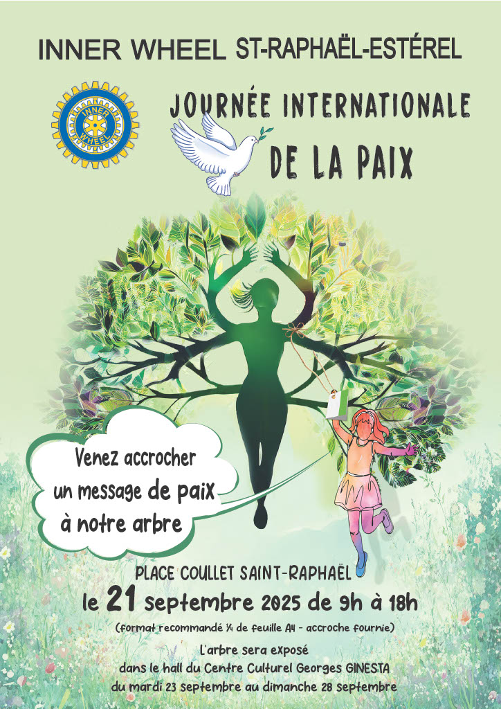 Le Club Inner Wheel Saint Raphaël Estérel a imaginé et réalisé un arbre de la Paix qui sera exposé durant la journée du 21 septembre Place Coullet à Saint Raphaël, afin que chacun vienne y accrocher un message de paix. Les enfants pourront accrocher un dessin.