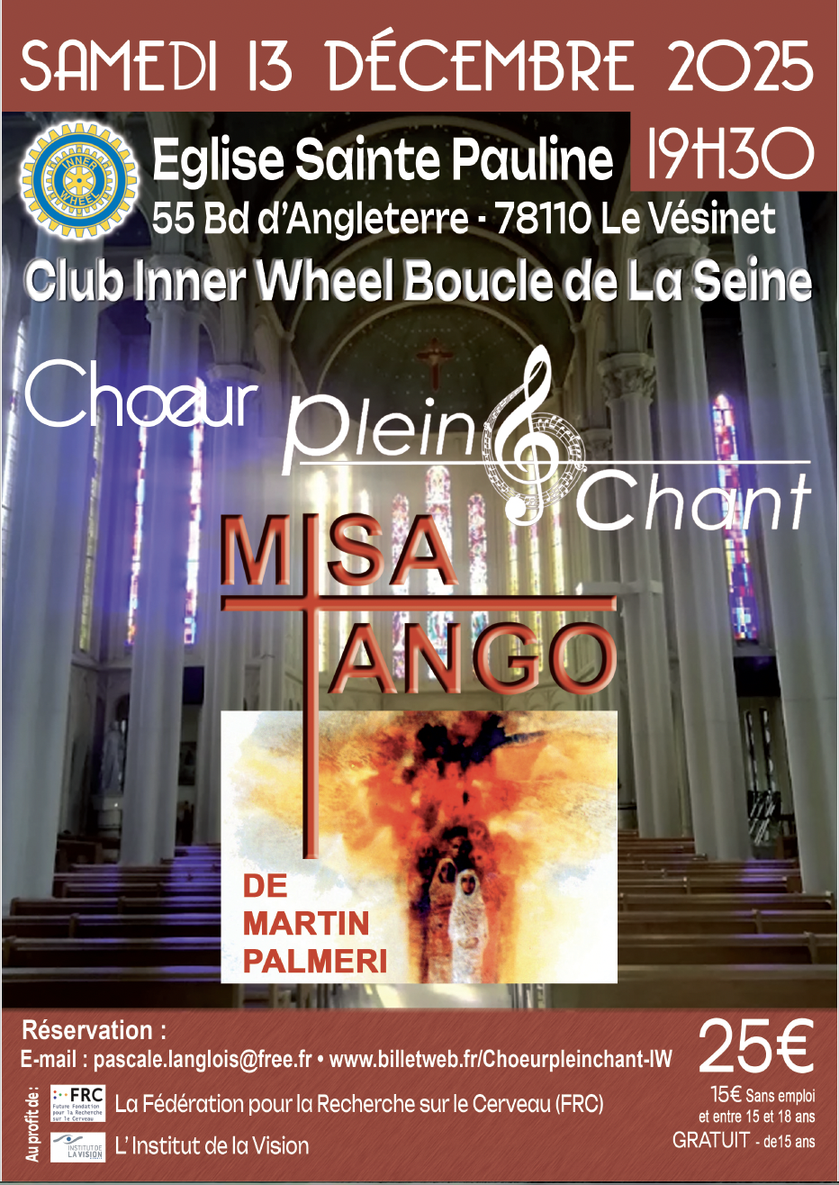 Le Club Inner Wheel Boucle de la Seine organise le 13 décembre prochain un concert avec le Choeur Plein Chant, au profit de la Fédération pour la Recherche sur le Cerveau (FRC) et de l’Institut pour la Vision. Au programme, la MisaTango magnifique œuvre de Martin Palmeri, mêlant ferveur sacrée et rythmes du tango argentin.