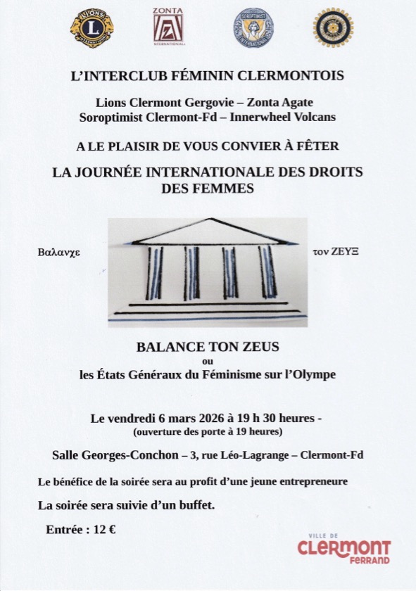 BALANCE TON ZEUS ou les États Généraux du Féminisme sur l’OlympeLe bénéfice de la soirée sera au profit d’une jeune entrepreneure.La soirée sera suivie d’un buffet.Entrée : 12 €