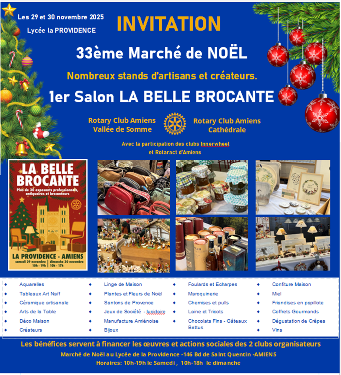 Ce marché de Noël est effectué en partenariat avec le club Rotary Vallée de Somme à Amiens, qui propose de nombreux articles variés : habillement, maroquinerie, jeux, bijoux, plantes, chocolat, miel, aquarelles et autres oeuvres d’art