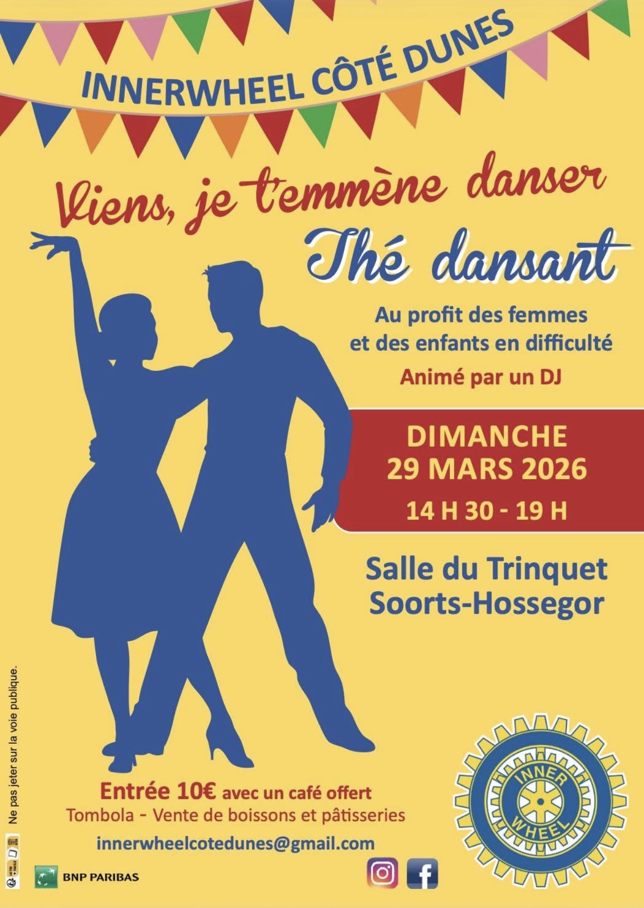 le club INNERWHEEL CÔTÉ DUNES Capbreton-Hossegor-Seignosse a le plaisir de vous inviter à participer à son troisième thé dansant animé par Loïc le dimanche 29 mars 2026 dans la salle du Trinquet de Soorts (40150)<br />